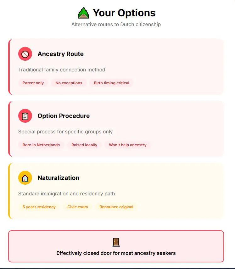 That’s it. No grandparents, no great-grandparents, no exceptions. If your Dutch connection is one generation removed, you’re out of luck. The “option procedure” sounds like it might help, but it’s designed for specific groups like people born and raised in the Netherlands.