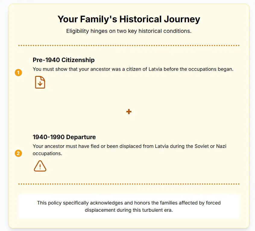 This historical requirement acknowledges the forced displacement that affected thousands of Latvian families during these turbulent decades. The pre-1940 citizenship requirement establishes the baseline connection, while the 1940-1990 exile provision covers families who fled or were forcibly removed during the occupations.