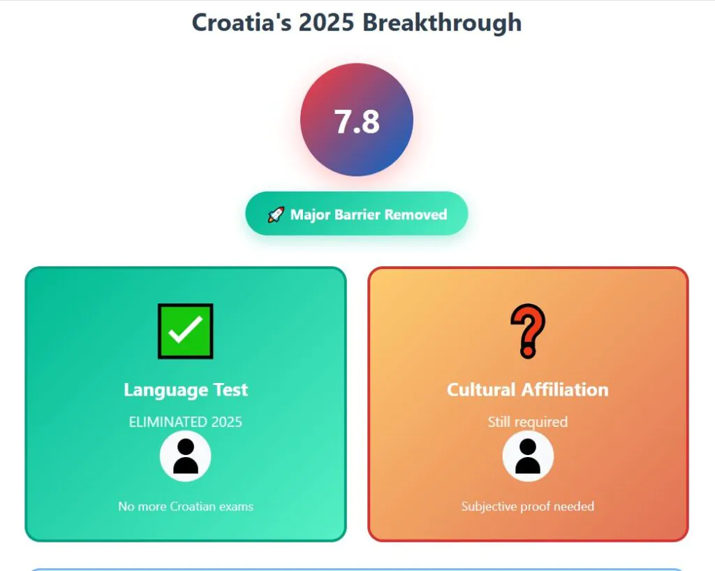 This creates a situation where a major barrier was removed, but a subjective one remains. The removal of Croatian language and culture tests as of 2025 represents a major improvement for English-speaking applicants.