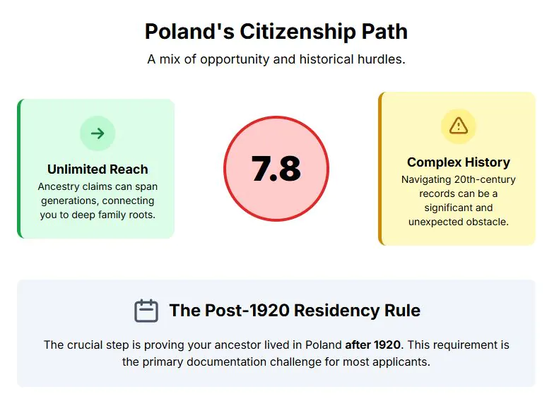 Poland scores 7.8 out of 10, offering unlimited generational reach but requiring navigation of complex 20th-century history. Poland will accept claims going back centuries, but your ancestor must have lived in Poland after 1920. This post-1920 residency requirement creates a documentation challenge that catches many applicants off guard.