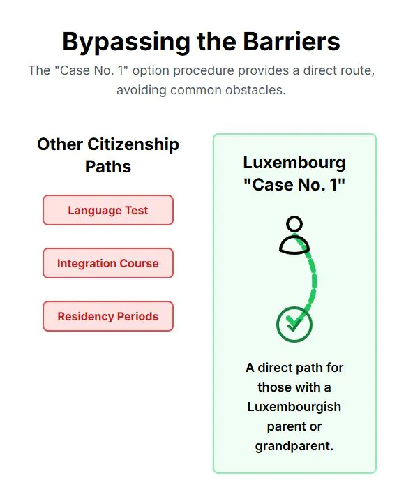 This exemption makes Luxembourg significantly more accessible compared to other citizenship paths that demand these requirements. Luxembourg’s option procedure is one of the most straightforward in the EU, but limited to two generations.