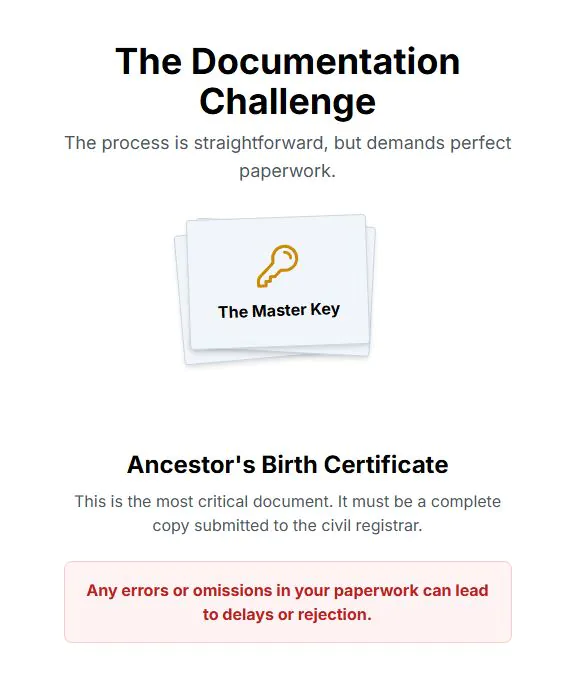 This pathway requires providing a complete copy of your ancestor’s birth certificate and other necessary documents to the civil registrar.