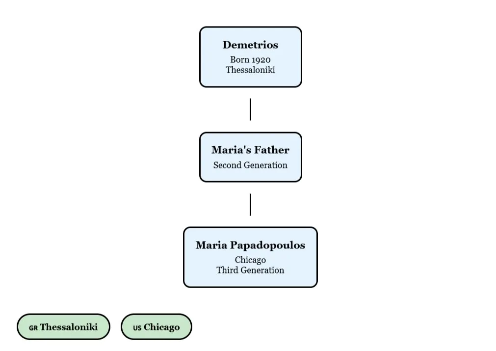 Her grandfather Demetrios was born in Thessaloniki in 1920 but moved to America in 1945. Maria must register Demetrios birth, marriage, and death records with Thessaloniki’s municipality, then register her father’s birth and marriage, and finally register her own birth to complete the ancestral chain. The parent/grandparent limitation means you need Greek parents or grandparents to qualify.