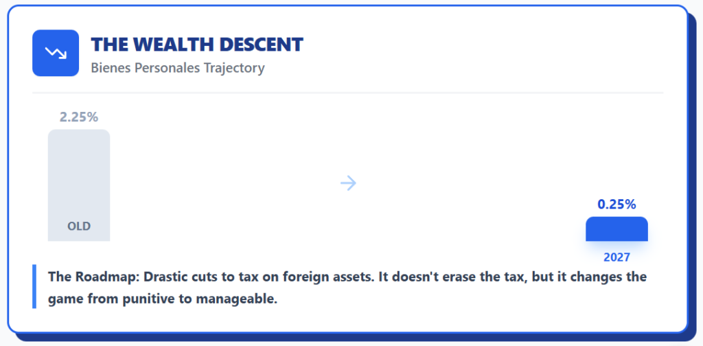 Start with the Argentinian wealth tax, or Impuesto sobre Bienes Personales. Before the reforms, assets held abroad could face rates up to 2.25%.