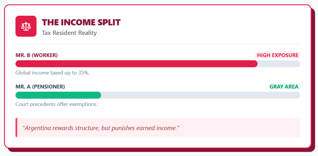 For retirees, foreign pensions are exempt because Uruguay does not classify them as capital yields. For higher earners like Mr. B, the territorial principle is the deciding factor.
