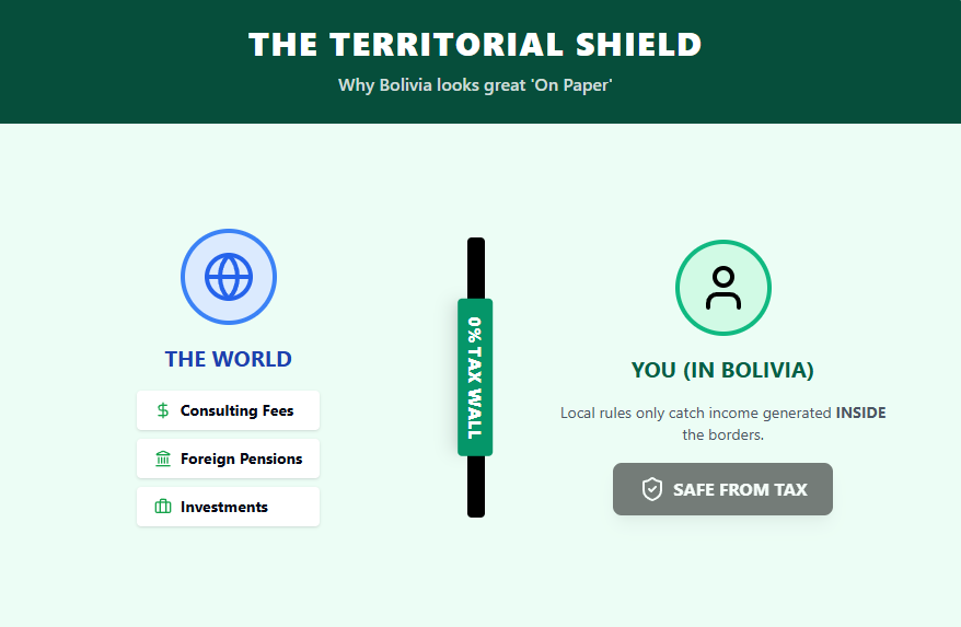 It taxes income generated inside Bolivia and leaves foreign-source income outside the net. A foreign pension or money paid by an overseas client usually does not become taxable just because you live there.