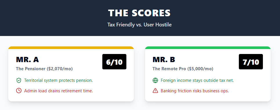 For Mr. B, this is the attraction. If his higher income comes from remote consulting for foreign clients, the territorial rule turns it into tax-free income.