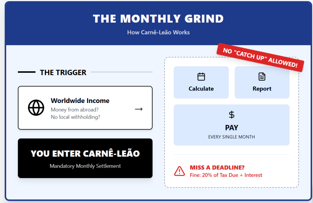 Brazil taxes that foreign income, and for this profile, it can hit the top marginal rate of 27.5%. Instead of one annual decision, you manage twelve deadlines and twelve payments.