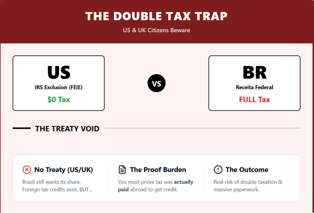 If you are a US citizen using the Foreign Earned Income Exclusion and paying $0$ to the IRS, Brazil still wants its share. Brazil allows tax credits only if you can prove the tax was actually paid abroad.