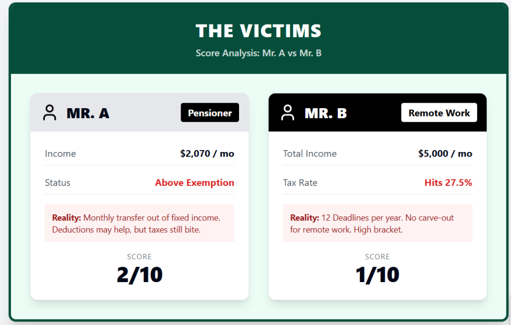 If your only income is a $2,070 monthly pension, this structure points to a 0% income tax outcome. Mr. B has a split result.