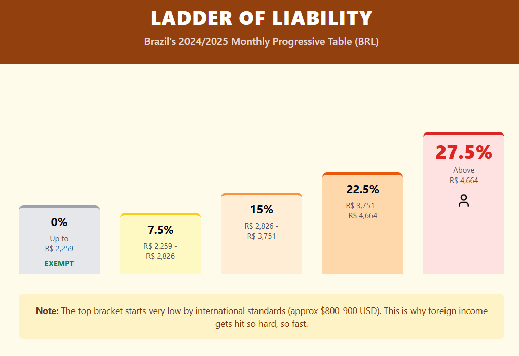 Brazil becomes expensive the moment you become a tax resident because it taxes you on worldwide income. If your money comes from outside Brazil, there are big chances you enter the Carne Leão system.