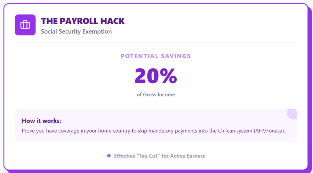 Chile also offers a social security exemption. If you can prove you keep coverage in your home system, you can be exempt from paying into Chile’s system.