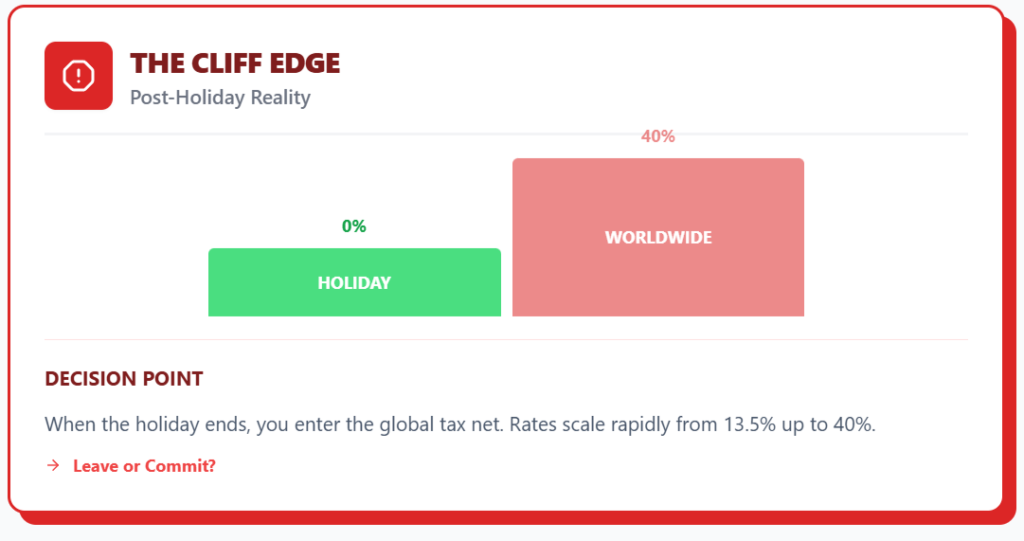 Mr. B’s $60,000 annual income often lands in the 13.5% to 23% range after the holiday. This marks the transition into the high-tax resident status.