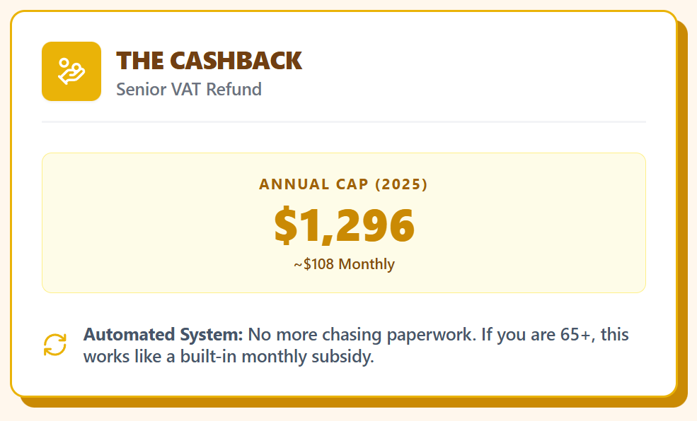 If you are 65 or older, the biggest perk is the VAT refund on personal goods and services. The monthly cap is about $108, or $1,296 per year back to you.