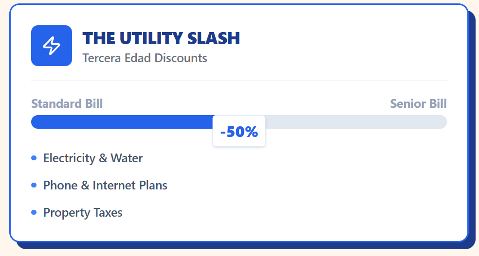 Utilities like electricity, water, and phone bills often get a 50% reduction for “Tercera Edad.” Property taxes also drop for seniors.