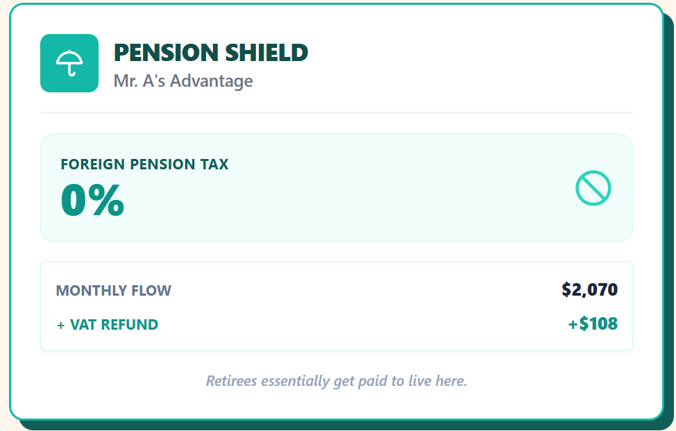 Mr. A lives on $2,070 per month from a foreign state pension. Ecuador does not tax foreign pensions, and he can still collect the VAT refund.