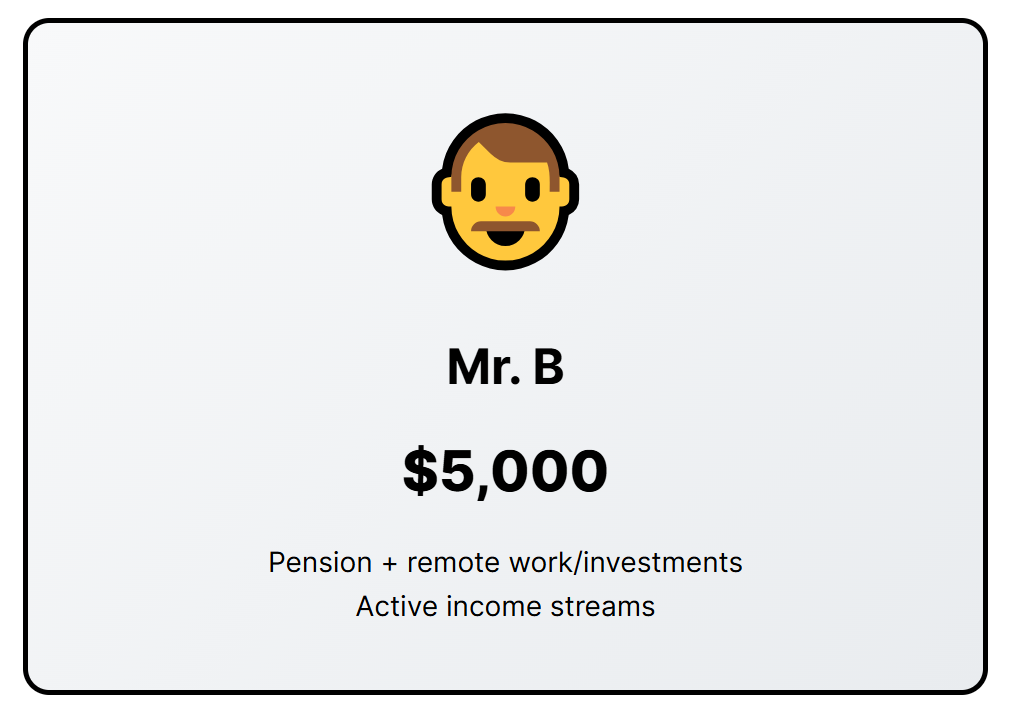 Mr. B earns $5,000 a month, mixing that same pension with $2,930 from remote work or investments.