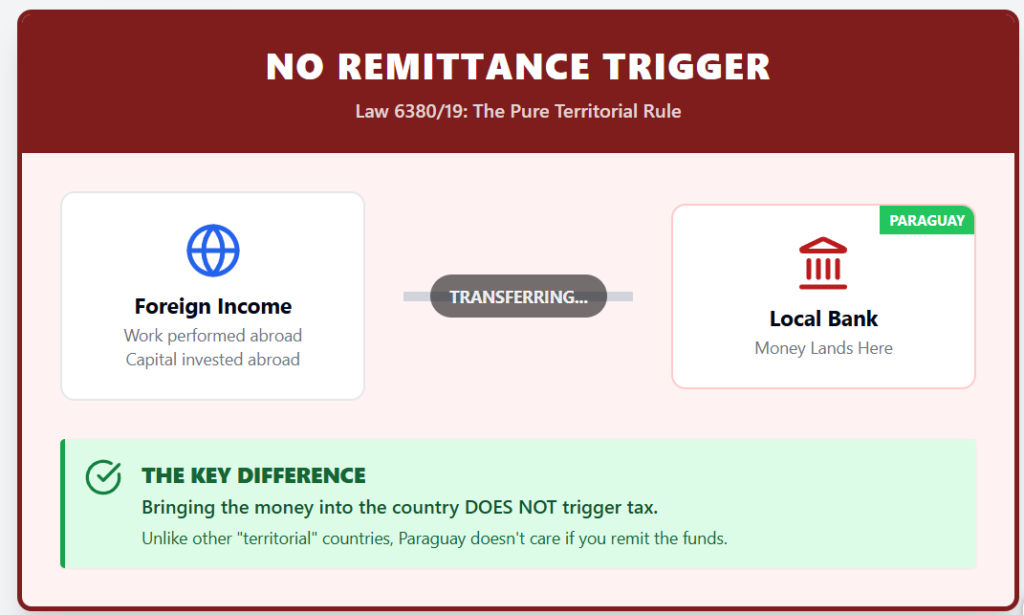 It does not matter if the money lands in a Paraguayan bank account. Paraguay has no “remittance” trigger that turns foreign income into local taxable income after you transfer it.