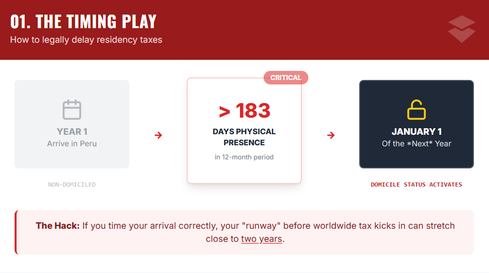 Peru gives you a timing play that most expats miss. The system splits people into “non-domiciled” and “domiciled,” and that label controls if foreign income is taxed.