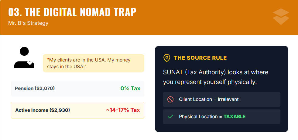 After the annual tax-free allowance of about 7 UIT (~36,000 soles), the effective rate often lands in the 14% to 17% range. If you perform work while physically in Peru, SUNAT treats that as Peruvian-source income.