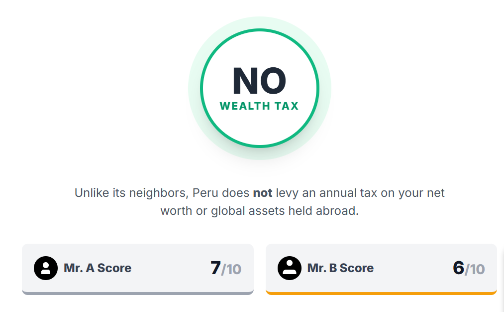 One advantage stays constant for both profiles: Peru has no wealth tax. If you hold investments abroad, Peru does not add an annual net worth bill on top.