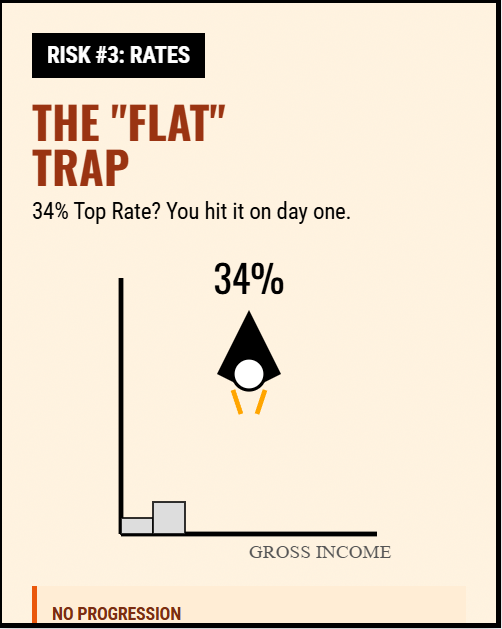 On paper, the income tax has progressive rates that go to a maximum of 34%. In practice, for a dollar earner, there is no real progressive climb.