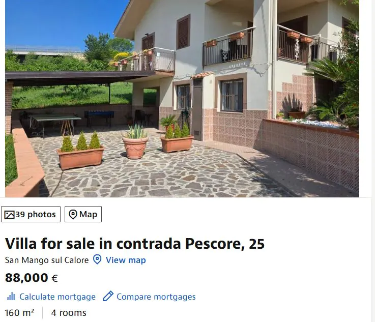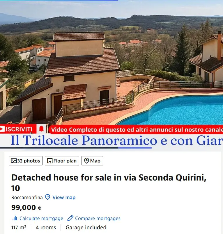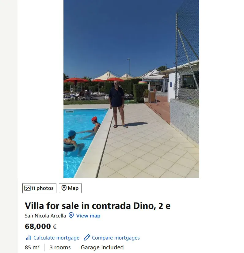 In San Nicola Arcella on the Calabrian coast, the market features an 85-square-meter villa with terrace, balcony, and communal pool for €68,000. This three-story holiday villa comes with a garage and provides access to one of Italy’s most dramatic coastlines. The property includes both a terrace and balcony (but not sure if it includes the man in the picture).