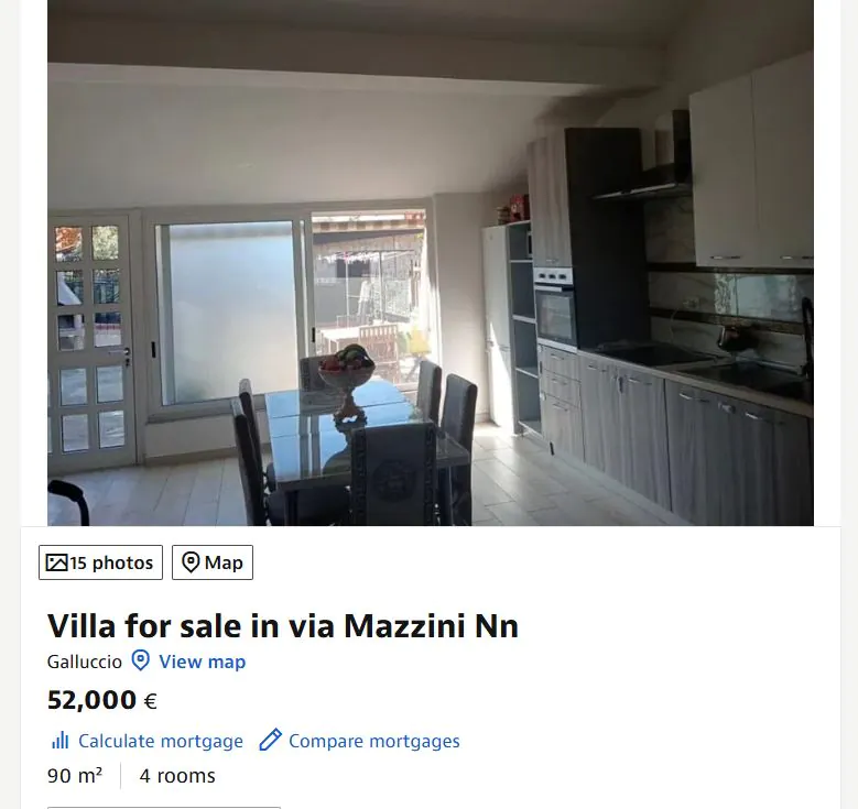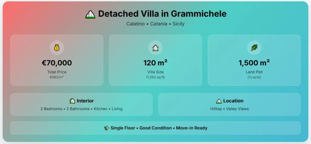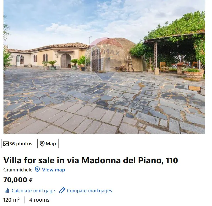 Grammichele, located in the province of Catania, Sicily, a town of 12,000 residents, has a detached villa available for €70,000, complete with a private garden and panoramic terrace.
