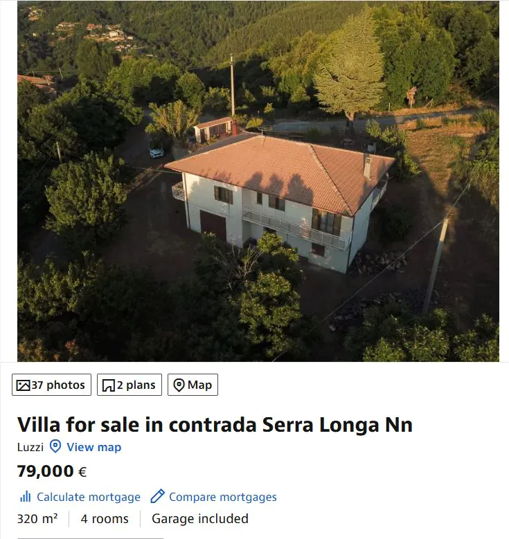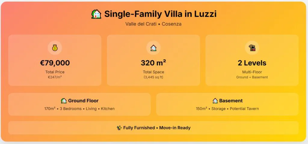 Luzzi in Calabria, situated in the Crati Valley, has a two-level villa with 3,444 square feet of space, private garden, four balconies, and a large basement. This town of 9,000 people sits at 376 meters above sea level, where the historic center perches on a hill while modern developments spread through the valley below.