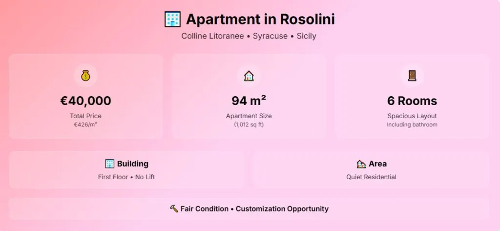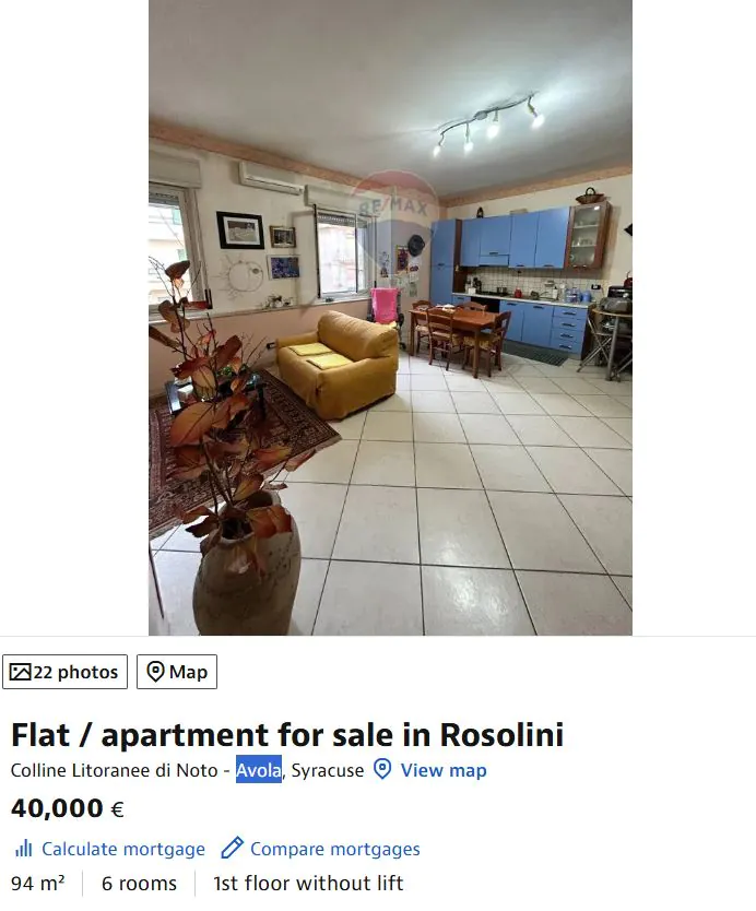 In Rosolini, within the Syracuse province, you can acquire a 94-square-meter apartment for just €40,000 in a town famous for its stunning Baroque architecture. This first-floor apartment sits in a vibrant town of 21,000 people at the foot of the Hyblaean Mountains, where the economy thrives on agriculture, particularly almonds, olives, and wine production.