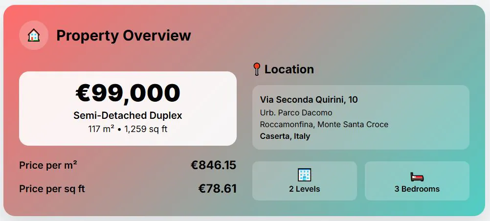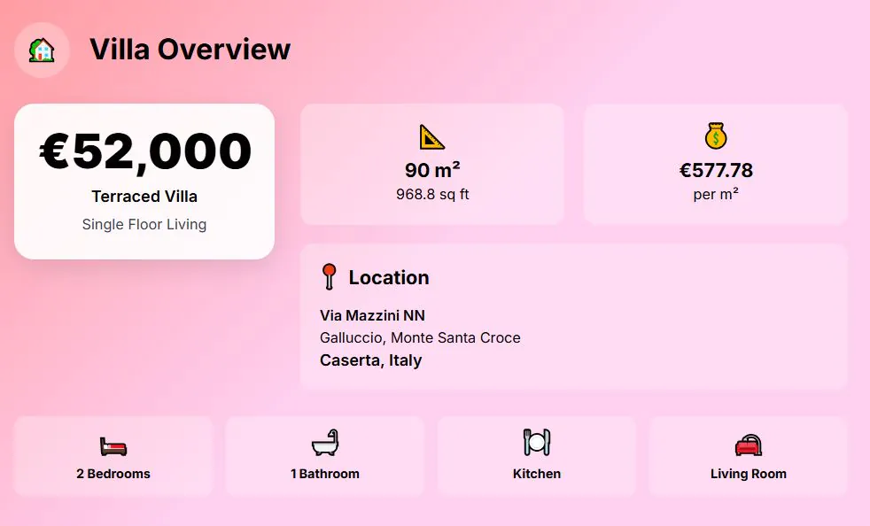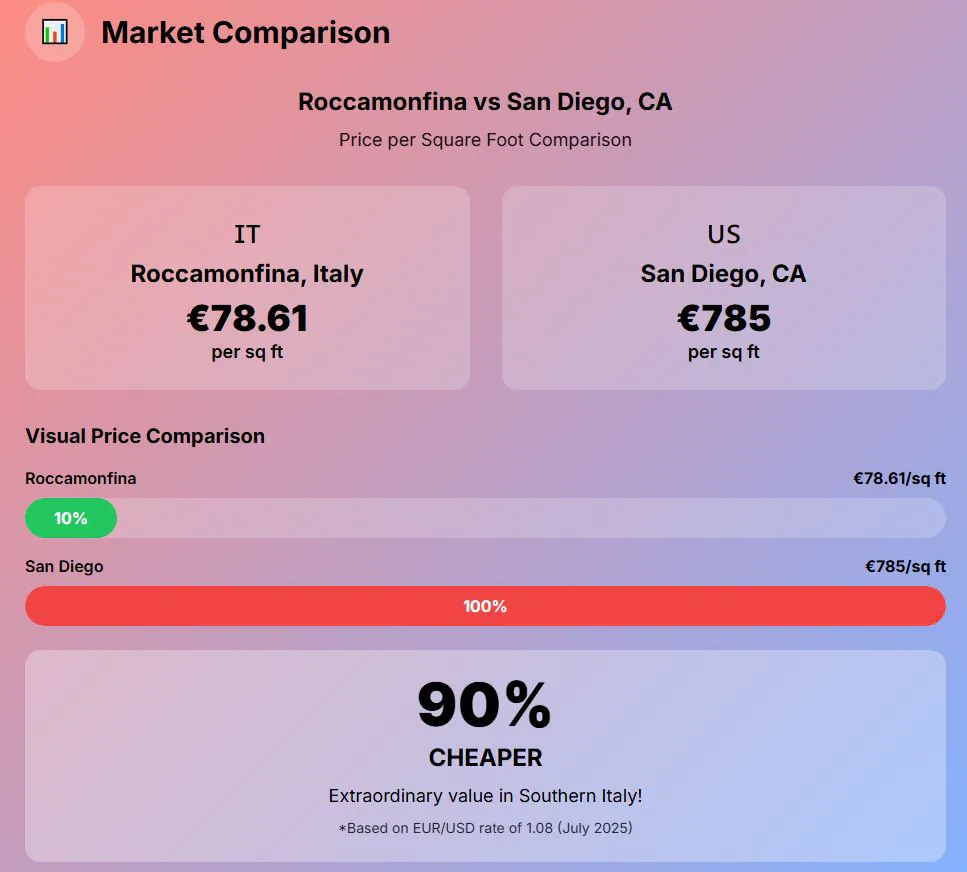 The price per square foot for this home in Roccamonfina is approximately 90% cheaper than the average real estate price in San Diego, California.