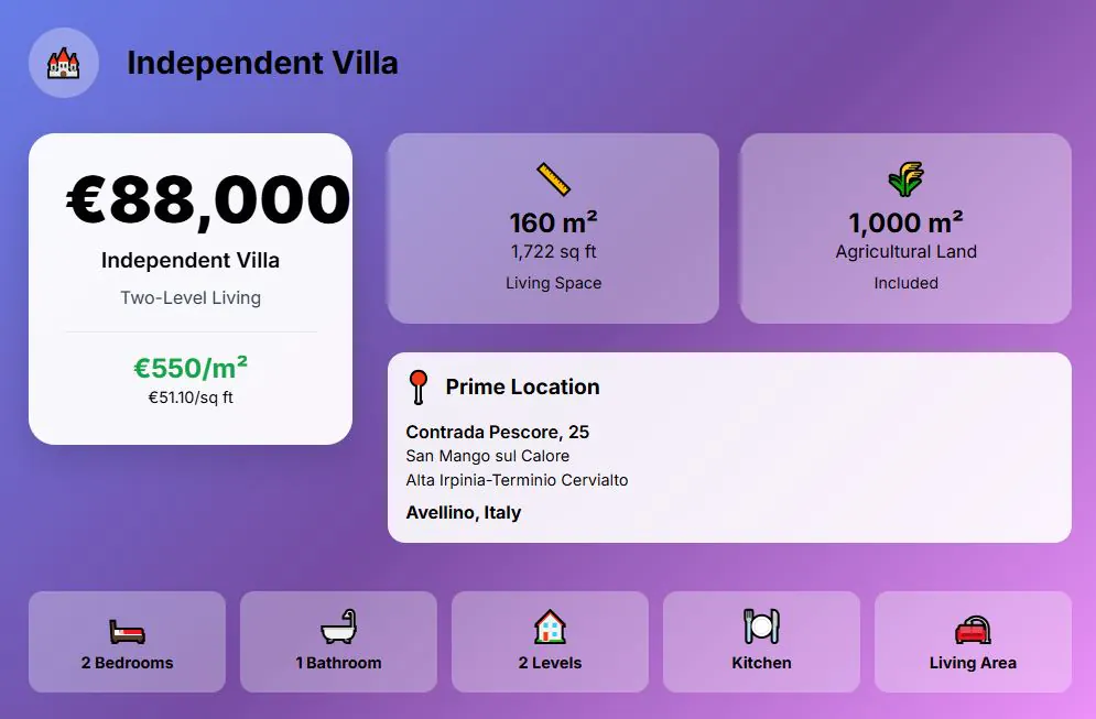 In San Mango sul Calore, located in the Irpinia region of Campania, you’ll find the unique possibility of complete independence with a 160-square-meter villa plus 1,000 square meters of agricultural land. This municipality sits in a fertile valley where agriculture drives both the economy and cultural identity, creating a community connected to the land.