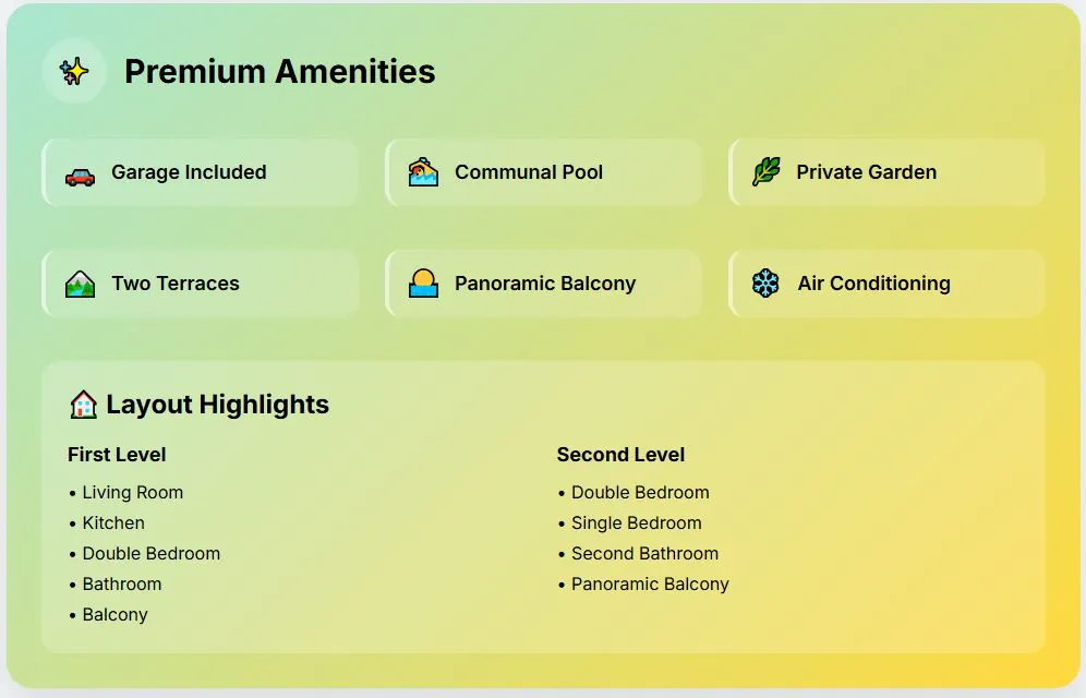 Your villa features a unique domed ceiling room with fireplace, panoramic views, and you’re living in a town known for its 17th-century city planning. The detached home includes a private garden and a panoramic terrace. The domed ceiling room with fireplace creates a focal point for the home.