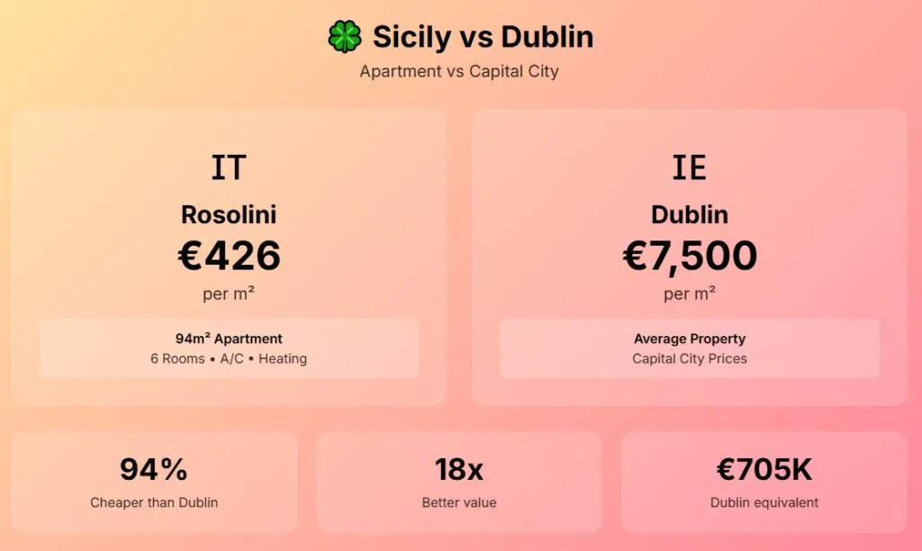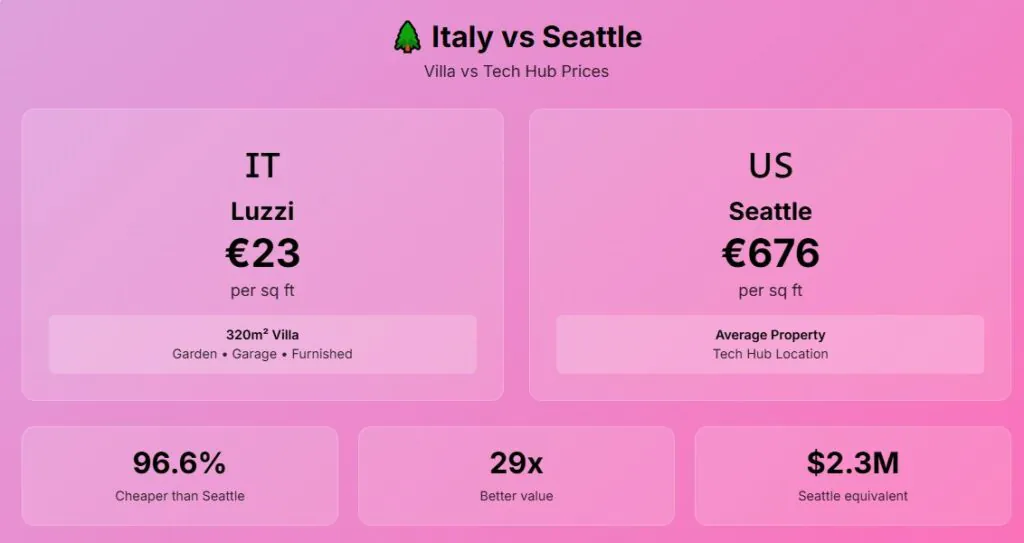 At €22.93 per square foot, you’re paying 96.6% less than Seattle. The €79,000 asking price represents extraordinary value when compared to major American cities.