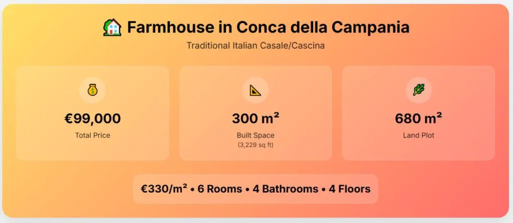 Conca della Campania presents a unique opportunity with a 300-square-meter farmhouse over four floors for just €99,000 in a well-preserved medieval town. This municipality sits in the heart of Campania, where stone streets wind between ancient gates and historic churches. The farmhouse spans four complete levels.
