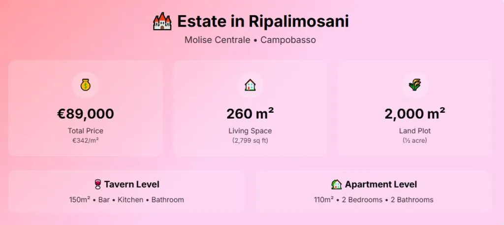 Ripalimosani in Molise, a town of 3,500 residents, features an extraordinary 260-square-meter estate with a 150-square-meter tavern complete with bar, kitchen, and bathroom, all for €89,000. The main building provides living quarters while the tavern space sits ready for business operations. The estate includes 2,000 square meters of land, giving you room for outdoor seating, events, or agricultural activities.