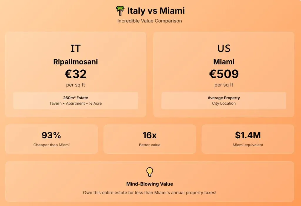 At €31.80 per square foot, you’re paying 93% less than Miami. For less than the annual property taxes on a luxury Miami condo, you could own this entire 260-square-meter estate with a half-acre of land outright.
