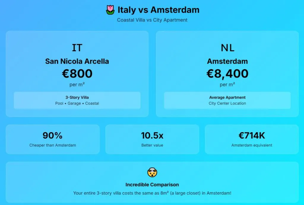 At €800 per square meter, you’re paying 90% less than Amsterdam – but getting something Amsterdam can never offer: coastal living with swimming weather. For the price of about 8 square meters in the Dutch capital, you could acquire this entire 85-square-meter villa with garage and pool access.