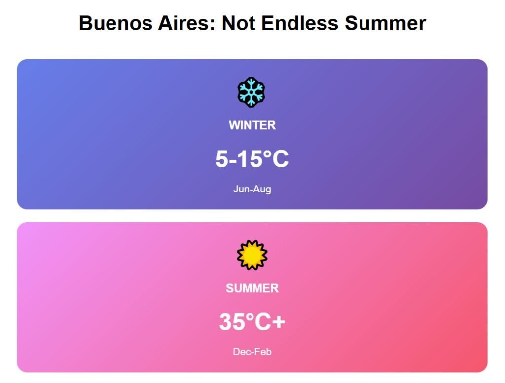 You can’t have consistent weather across such massive geographic diversity — each region brings distinct seasonal patterns and temperature extremes. Buenos Aires has winters dropping to 5-15°C and summers reaching 35°C. The capital gets cold enough to require heating from June through August, and hot enough during summer to turn on air-conditioning.