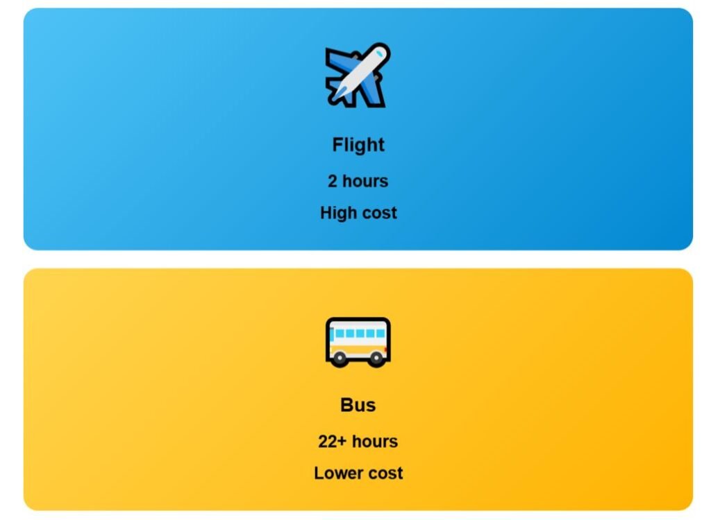 Multi-day bus travel is physically demanding — extended sitting and uncomfortable sleeping challenge physical stamina. Domestic flights provide speed but cost US$200 to US$300 for routes that should be affordable rail journeys.