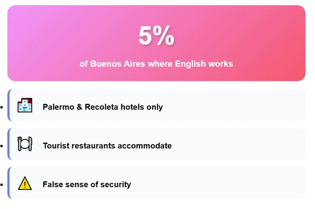 Tourist areas in Buenos Aires create the illusion that English fluency works for daily life. Hotels in Palermo and Recoleta employ bilingual staff, for example. But this bubble gives you false confidence about language requirements.