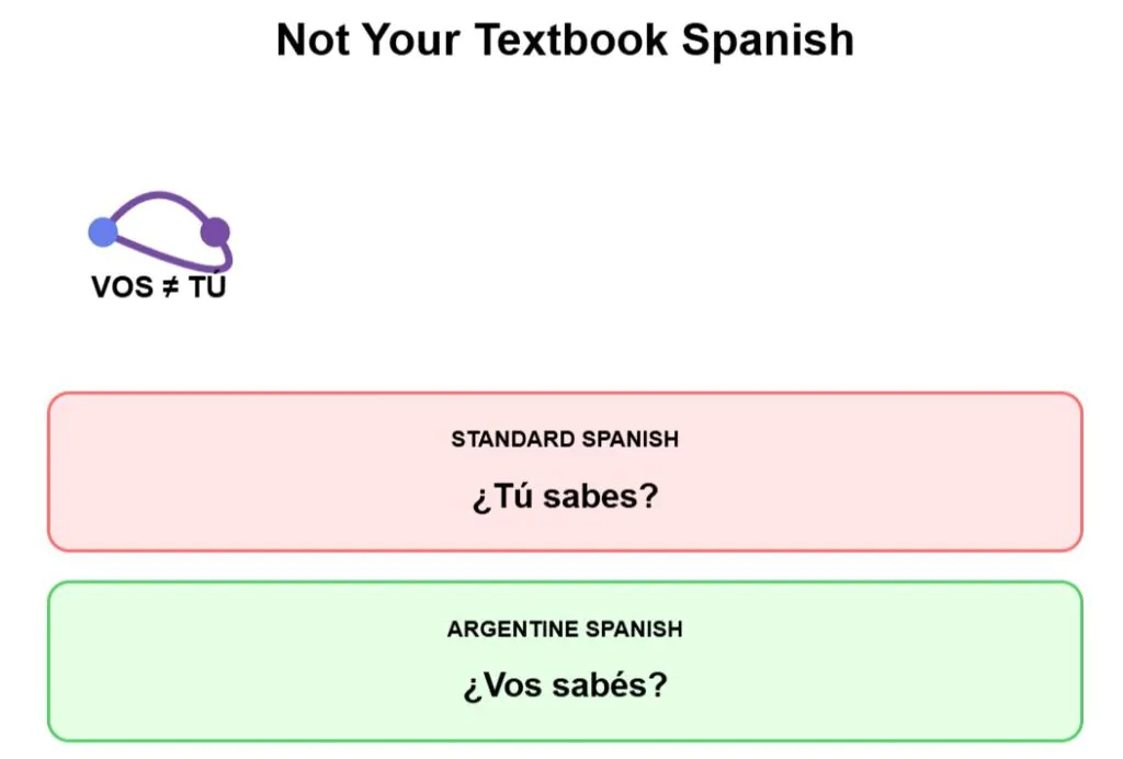 In Buenos Aires, they swear they speak better, but the pronunciation carries Italian influence that changes familiar words — lunfardo slang. Essential Lunfardo terms include “Che” for “hey” or “mate,” “Boludo” as “dude,” “Plata” for money, “Bondi” for bus, and “Quilombo” for mess or problem.