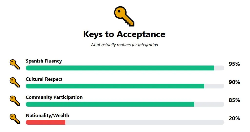 You must earn acceptance through cultural respect. Learning Spanish, understanding local customs, and so on matter more than your nationality or financial status.