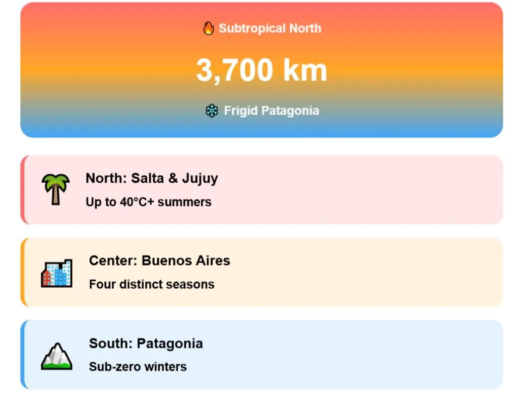 Argentina spans from subtropical north to frigid Patagonian south — climate varies dramatically by region. The country stretches 3,700 kilometers from Bolivia’s border to Antarctica’s doorstep.