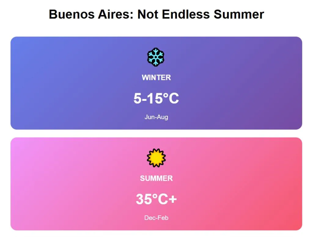 You can’t have consistent weather across such massive geographic diversity — each region brings distinct seasonal patterns and temperature extremes. Buenos Aires has winters dropping to 5-15°C and summers reaching 35°C. The capital gets cold enough to require heating from June through August, and hot enough during summer to turn on air-conditioning.