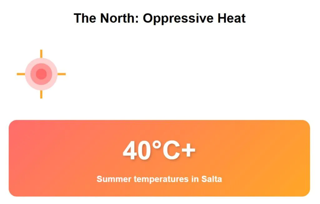 Northern areas battle oppressive heat and humidity with seasonal rains that require air conditioning and dehumidification. Salta and Jujuy provinces reach temperatures above 40°C during summer months. The combination of heat and humidity creates unbearable conditions without cooling systems.