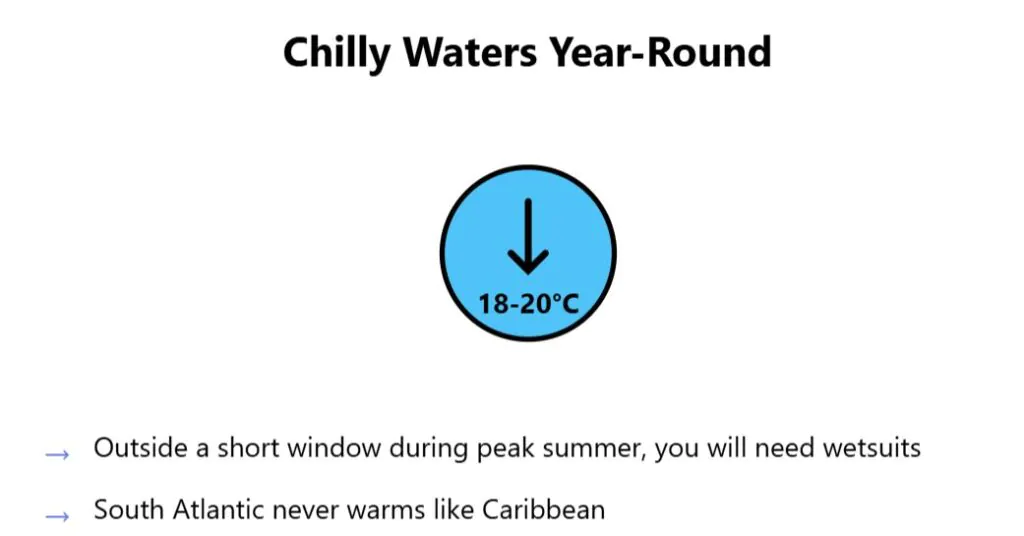 The South Atlantic Ocean doesn’t warm up like the Caribbean or Mediterranean. Water temperatures peak at 18-20°C during summer months — cold enough to require wetsuits for extended swimming. Most beach activities center around sunbathing and walking, not water recreation.