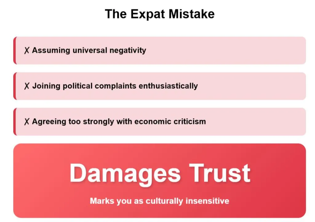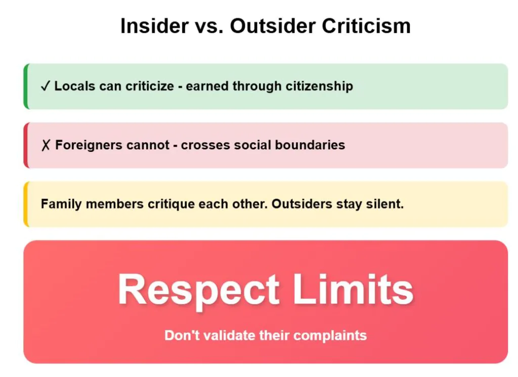Argentines earn the right to complain through citizenship and shared struggle. When foreigners join these conversations, they cross social boundaries that damage relationships. Family members can criticize each other, but outsiders cannot.