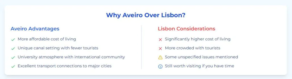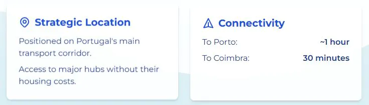 Aveiro’s strategic position on Portugal’s main transport corridor provides excellent connectivity. High-speed Alfa Pendular trains reach Porto in about an hour and the university city of Coimbra in just 30 minutes, giving residents access to major hubs without paying their housing costs.