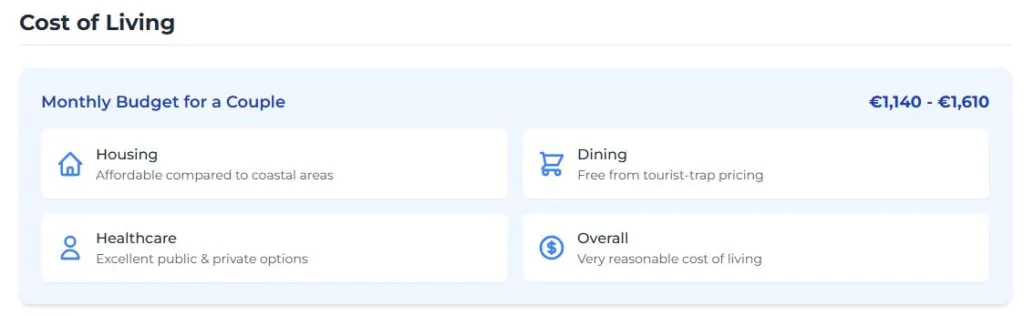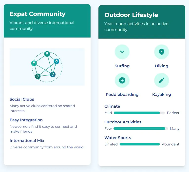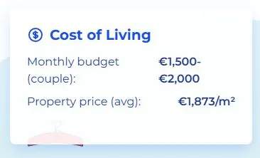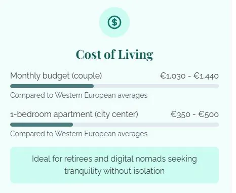 This premium coastal lifestyle comes at a higher cost. A couple’s monthly budget is around €1,950 to €2,300, with one-bedroom city-center apartments averaging €950 to €1,050. The vibrant and diverse expat community, with many active social clubs centered on surfing and hiking, makes it easy for newcomers to connect.